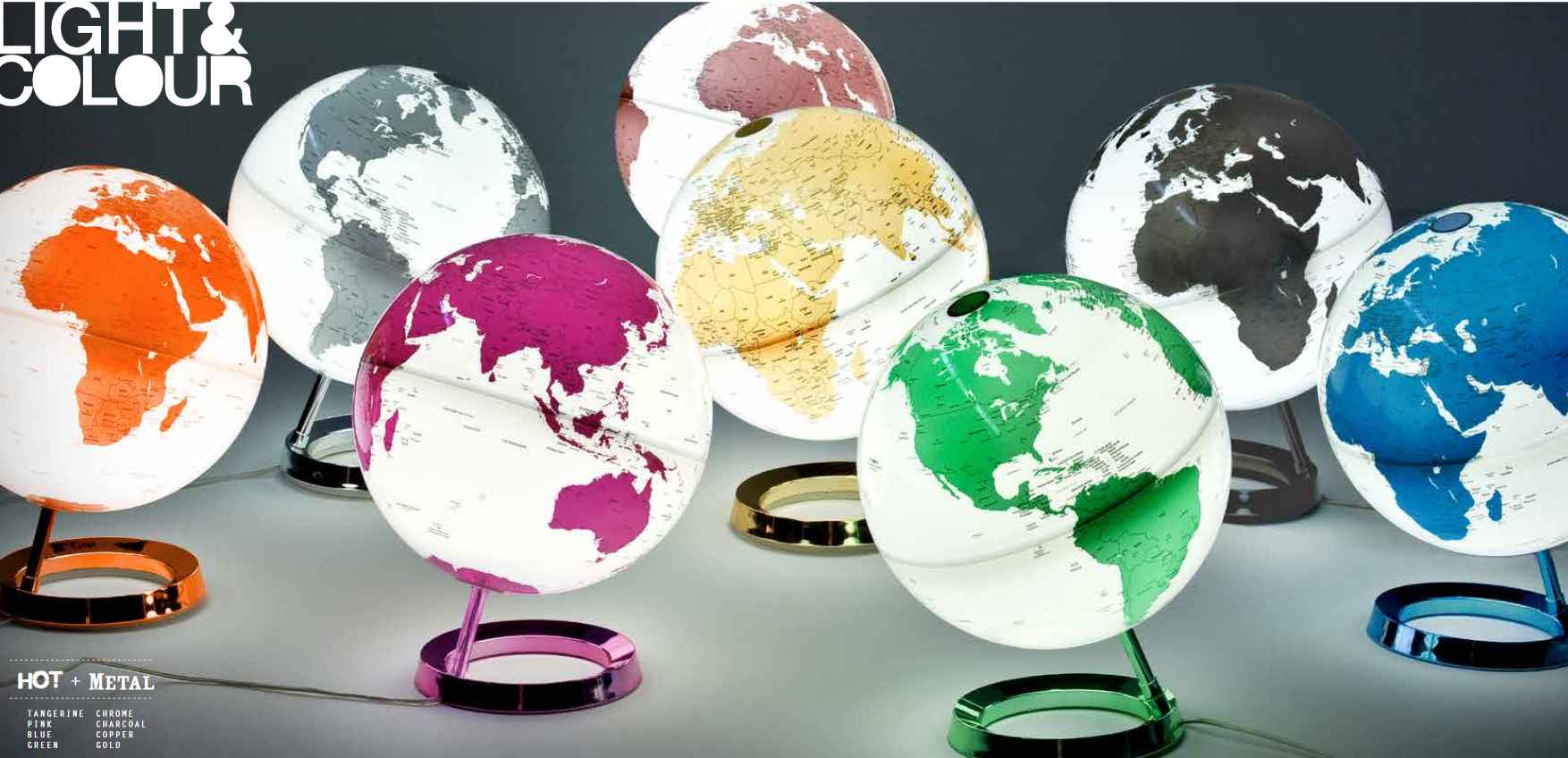 Light&Colour ist eine neue Produktline von Atmosphere, welche edles Design und außergewöhnliche Farben mit der kompakten Darstellung geografischer Informationen auf einem Globus verbindet.