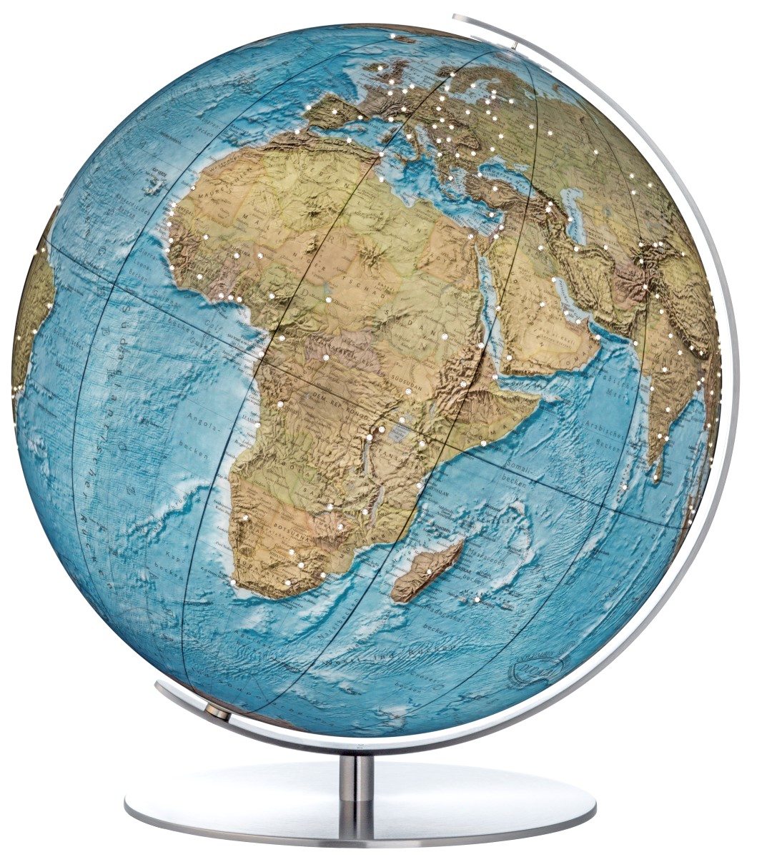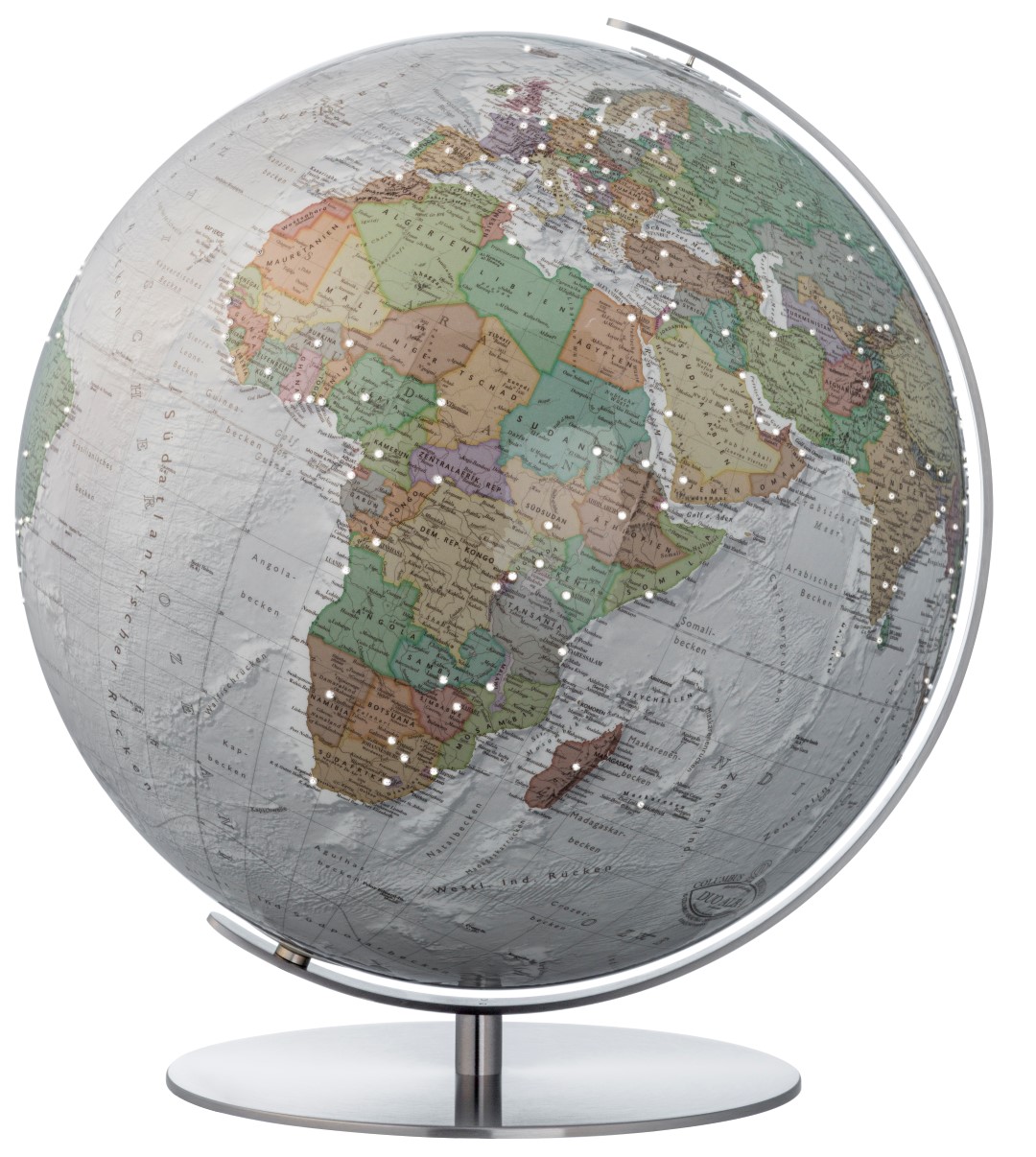 Er zeigt das politische Bild der Erde sowie deren Meeresstruktur. Durch die Innenbeleuchtung am Abend wechselt der Globus nicht nur sein