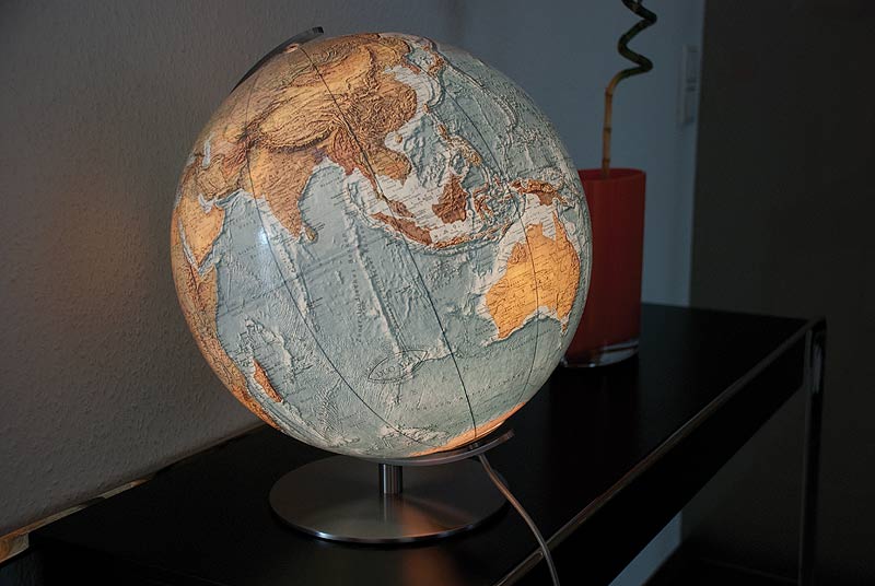 Er zeigt das politische Bild der Erde sowie deren Meeresstruktur. Durch die Innenbeleuchtung am Abend wechselt der Globus nicht nur sein
