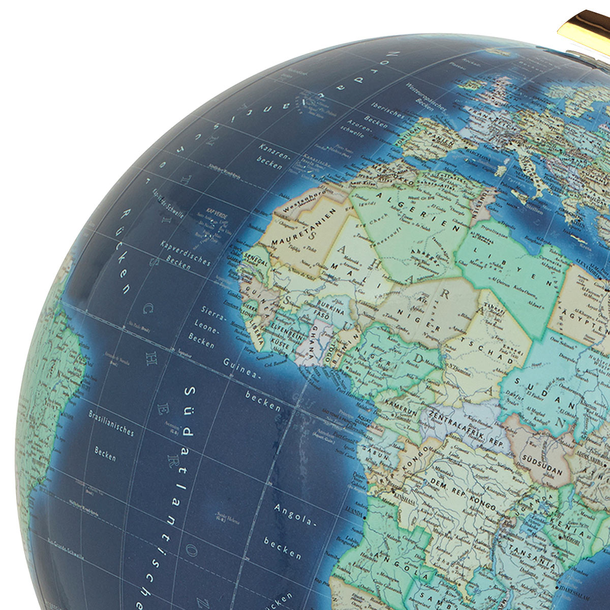Die Kontinente sind mit strahlend blauen Vignettierungen umrandet, die das gesamte Erscheinungsbild noch eleganter und attraktiver machen. Aber nicht nur im Meer bekommt man diese faszinierenden Effekte zu sehen, auch an Land bemerkt man die farblich harmonisch abgestimmten Länder und Grenzen der Welt, die bei Beleuchtung plastische, nahezu dreidimensionale Berge und Täler zeigen. Ein besonders empfehlenswerter Globus von Globus24.de.