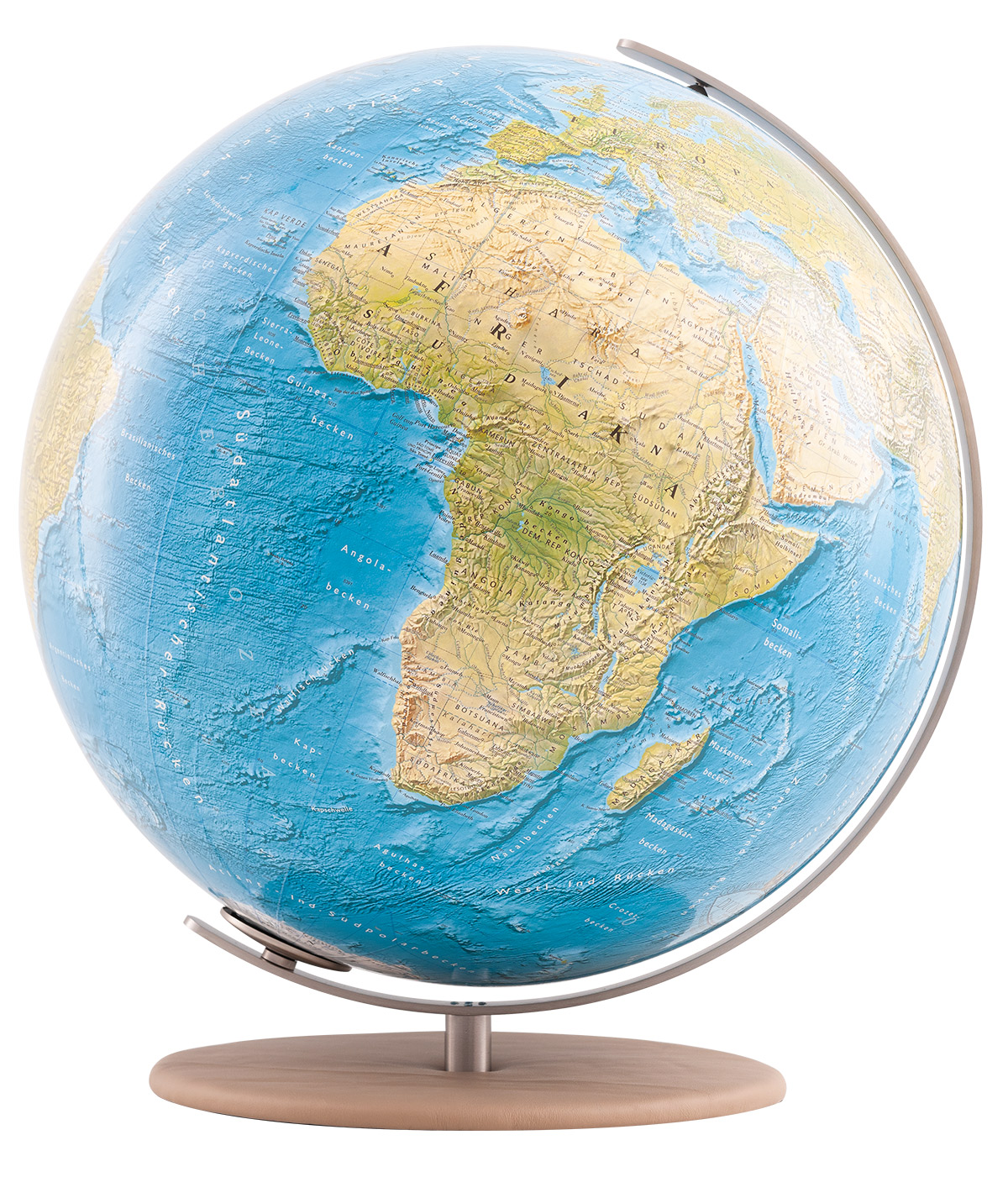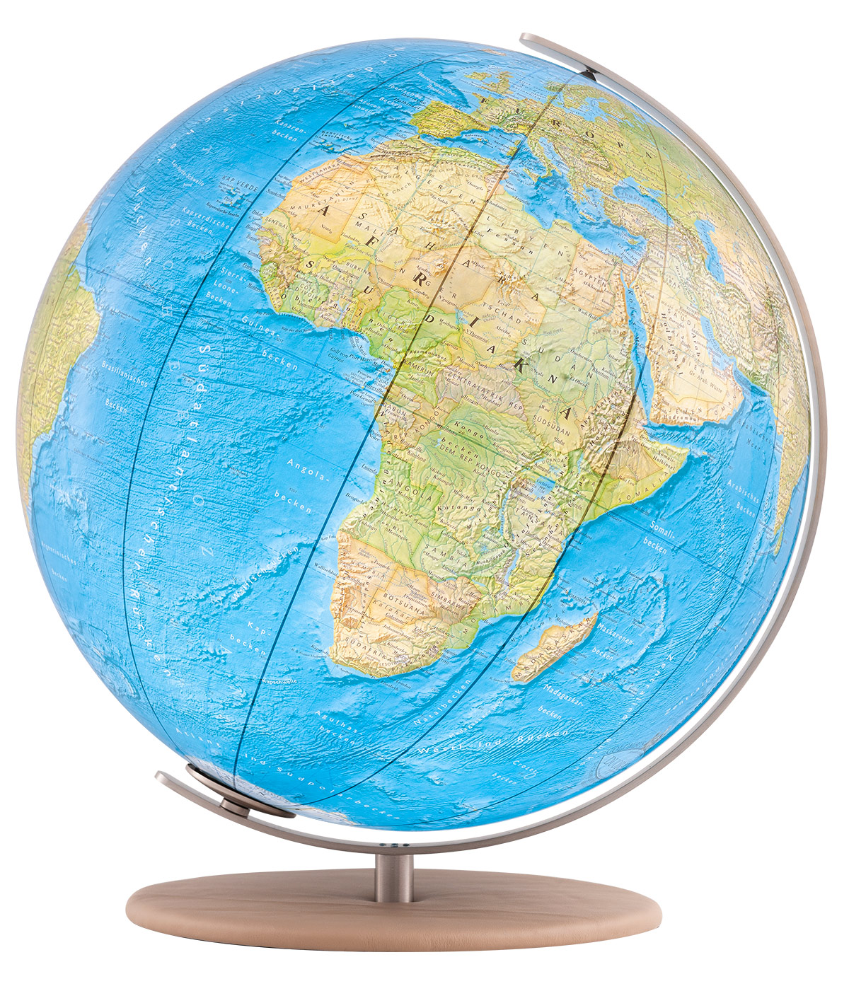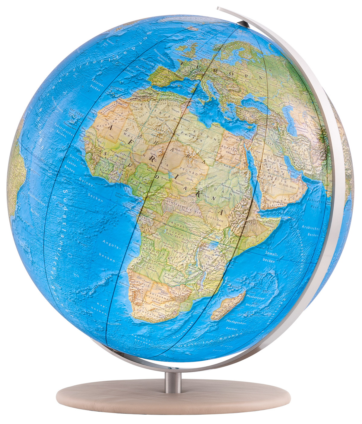 Der hochwertig belederte Fuß in beige Camel verleiht dem 40cm Duorama-Modell wahre Größe. Das qualitative Veloursleder lässt den Globus elegant und geschmackvoll wirken.