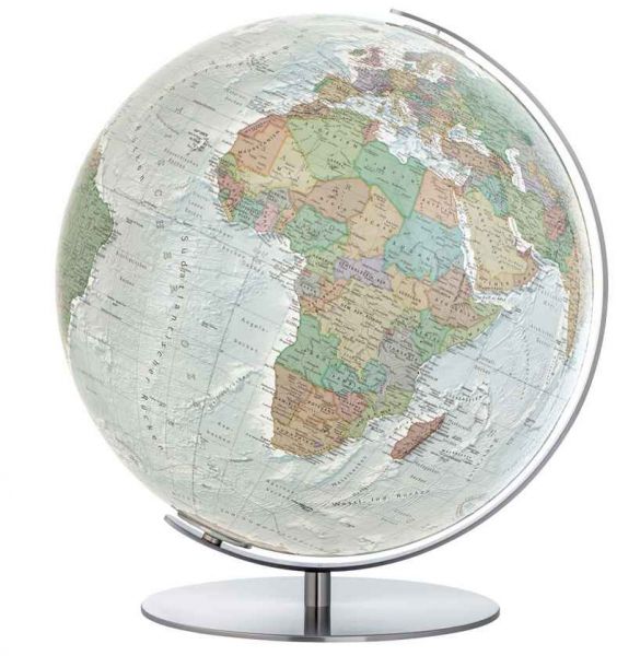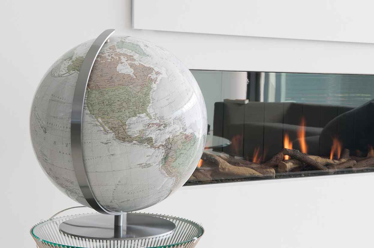Durch die Innenbeleuchtung am Abend wechselt der Globus nicht nur sein Kartenbild, sondern auch seinen Charakter. Die Meere erstrahlen im klassischen Blau, die Kontinente zeigen stolz ihre Erhöhungen durch ein plastisch wirkendes Relief in warmen Farbtönen und geben dem Raum ein angenehmes Ambiente.