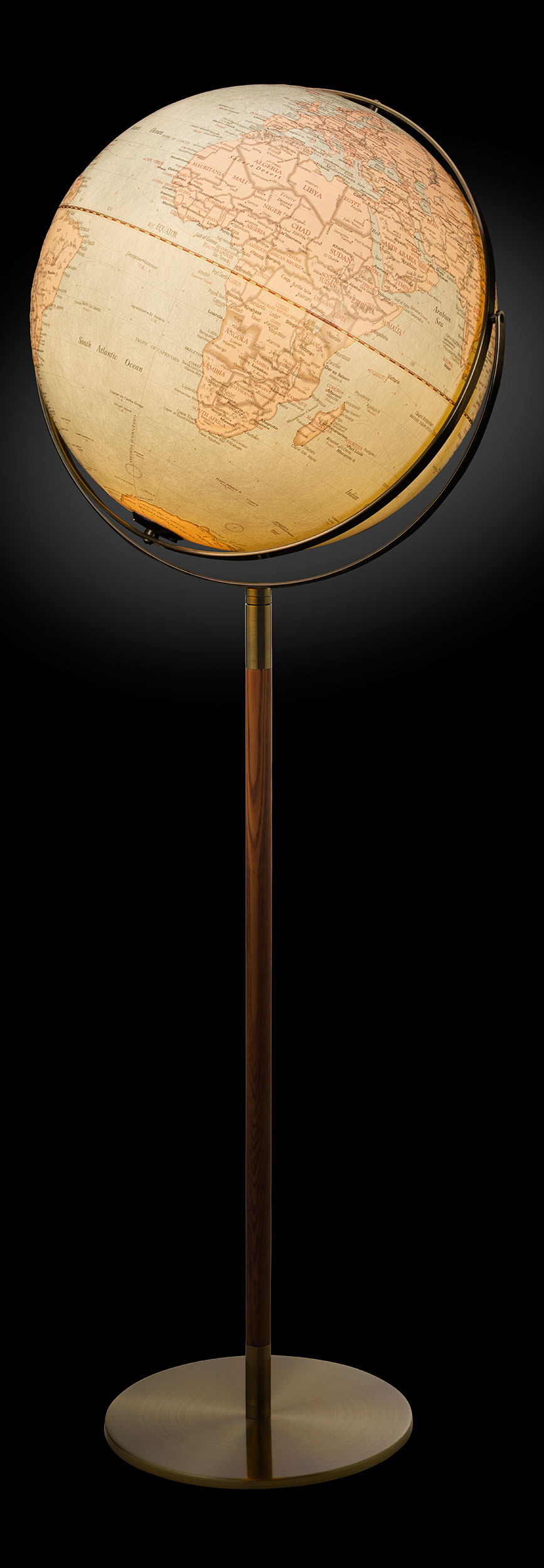 Akkustandglobus, dimmbar und aufladbar. Gunmetall-Gestell mit Holzapplikation im Antikdesign, Höhe 132cm, Durchmesser 43cm