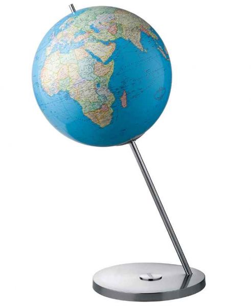 Die klassisch eleganten Fußausführungen, wahlweise als Gabel- oder Säulenfuß, erhalten ihren matt schimmernden Glanz durch ein ganz spezielles Edelstahlfinish. Die Globuskugel ist in einem Winkel von 23° in einem kreisförmigen Vollmeridian oder in einem klassischen Halbmeridian (Säulenfuß) aufgehängt.